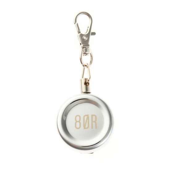 - Silver-toned 8OR retractable keychain