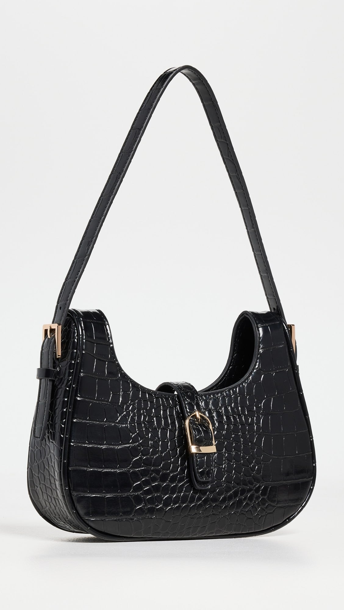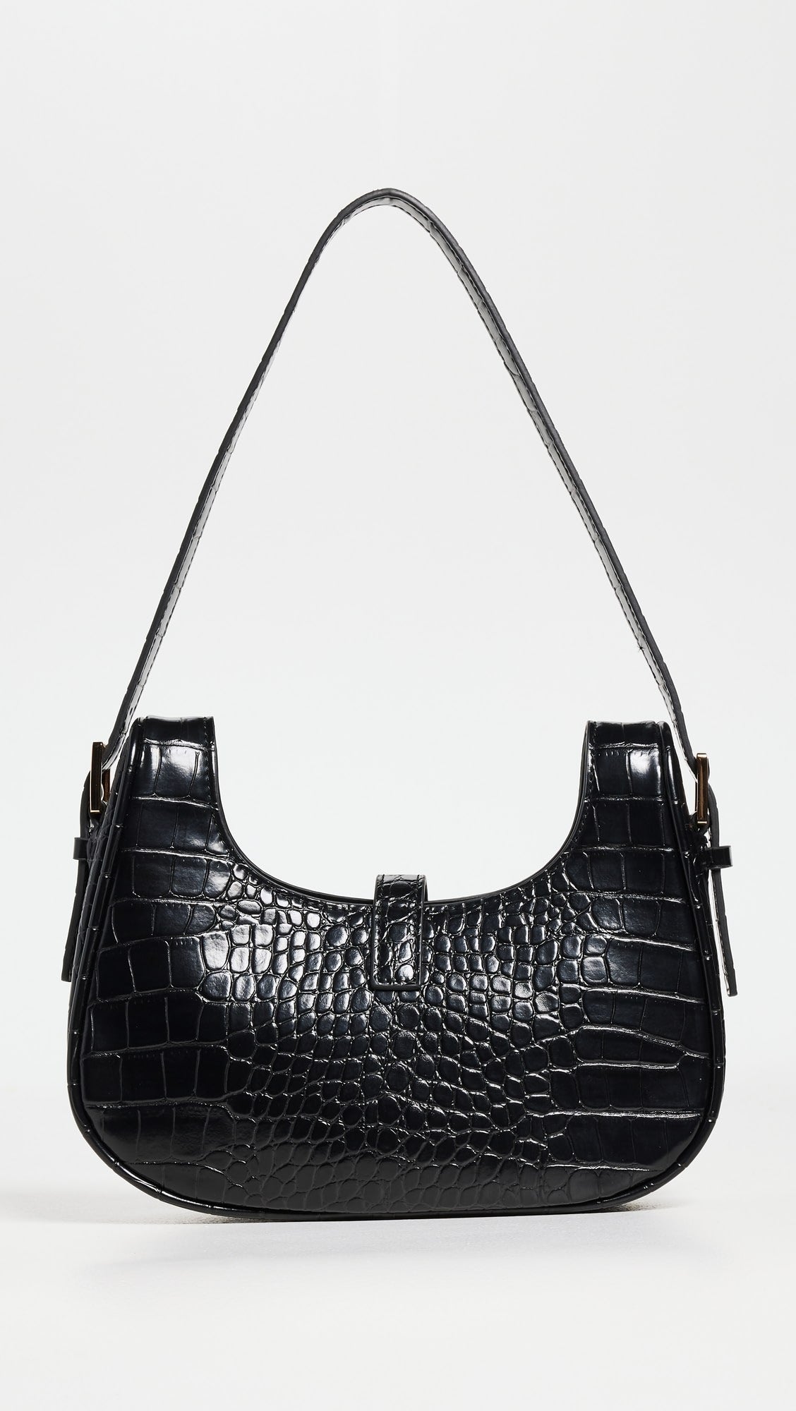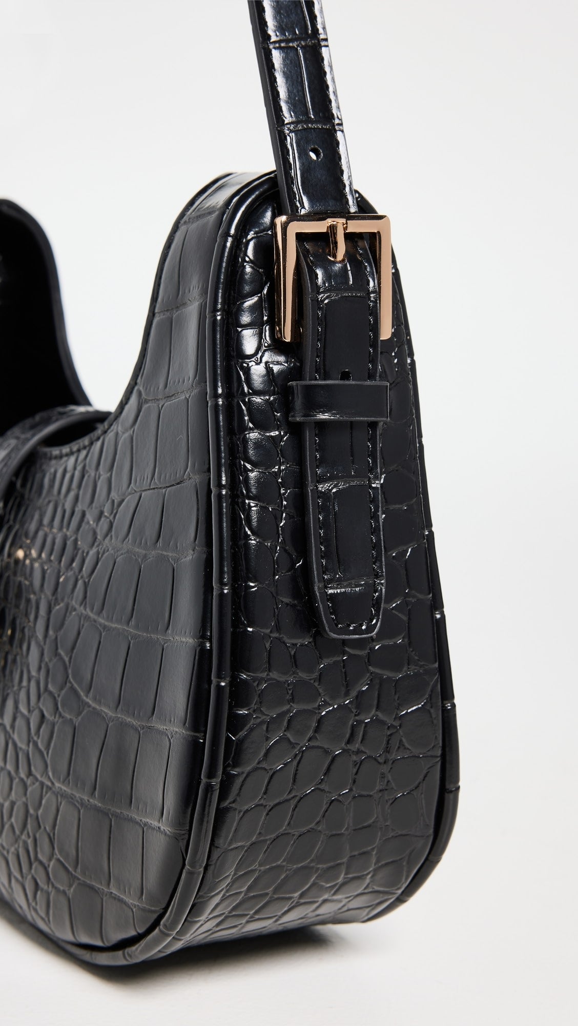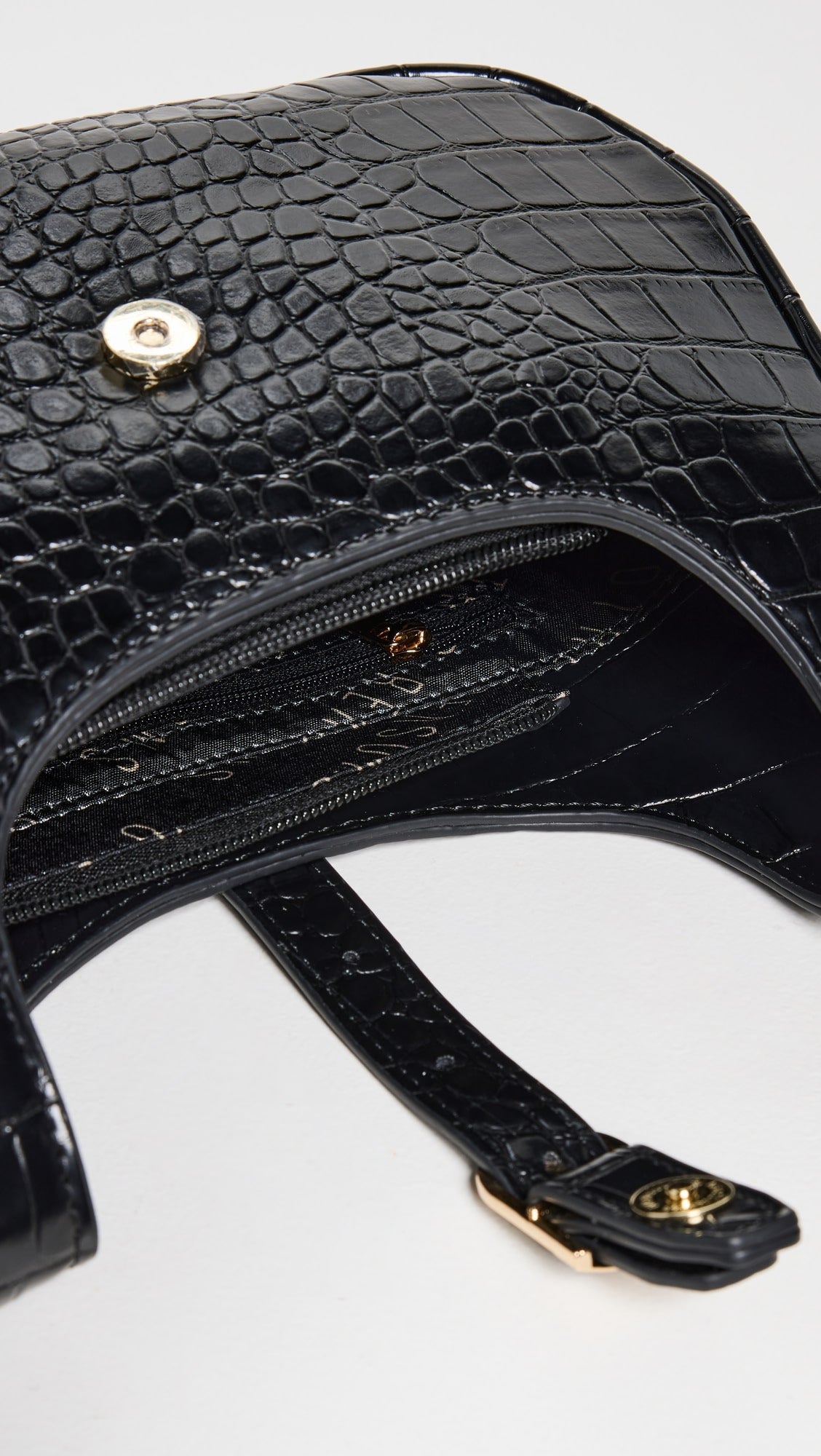 - Top zipper with gold-tone buckled strap and magnetic button closure