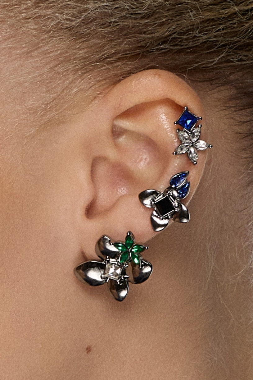 - Floral brushed gunmetal earrings with black onyx centers in a 3-piece set.