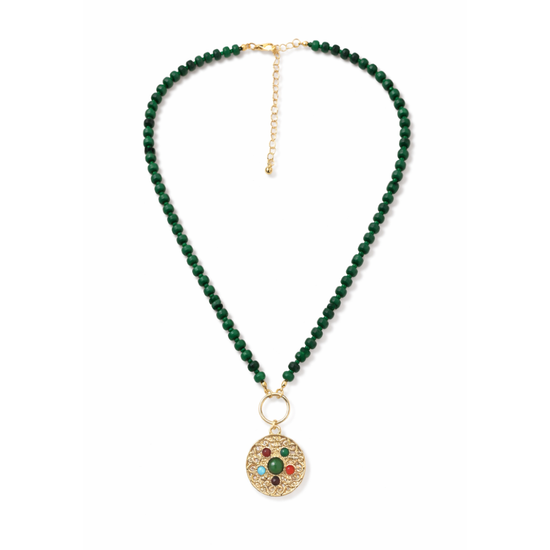 - Green beaded necklace with gold pendant